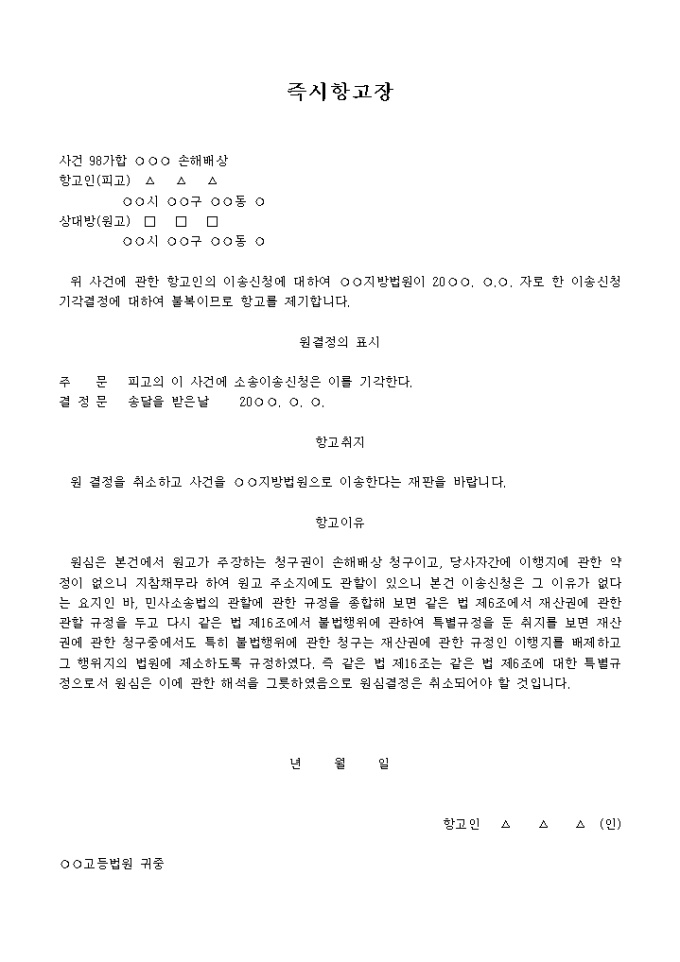 9,000원/월손해배상 사건에 관한 항고인의 이송신청에 대하여 ○○지방법원이 20○○. ○.○. 자로 한 이송신청기각결정에 대하여 불복함으로 항고를 제기한다는 내용입니다.
