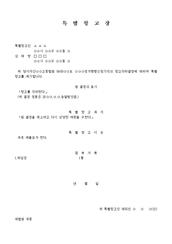 9,000원/월○○○정지명령신청기각의 항고각하결정에 대하여 특별항고를 제기한다는 내용입니다.
