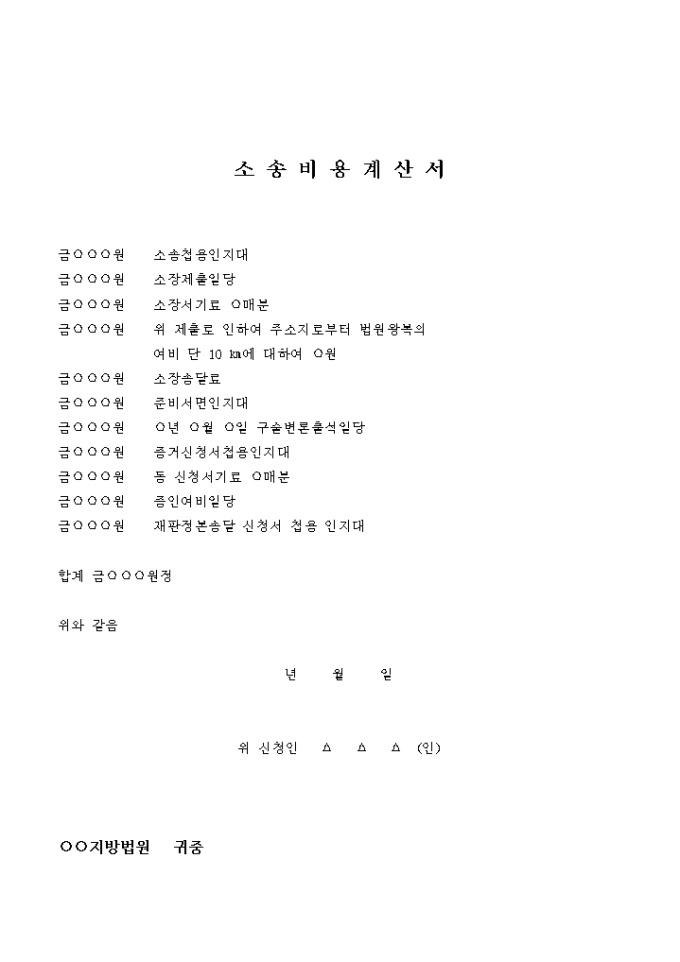 소송첩용인지대, 소장제출일당, 소정서기료, 소장송달료 등의 소송비용을 계산서하는 양식입니다.