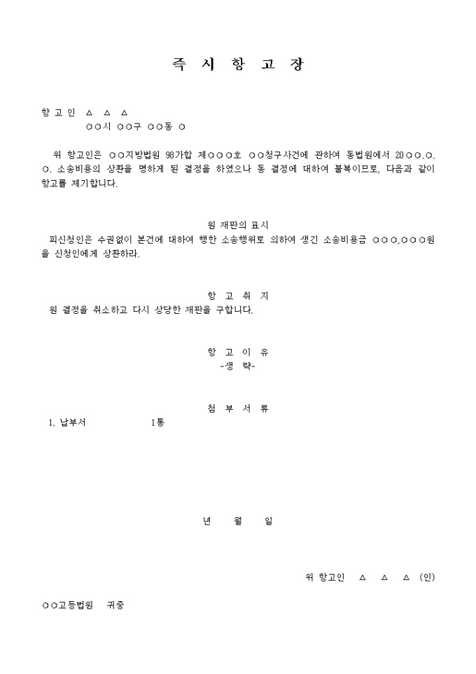 9,000원/월○○청구사건에 관하여 소송비용의 상환을 명하게 된 결정을 하였으나 동 결정에 대하여 불복함으로 항고를 한다는 내용입니다.