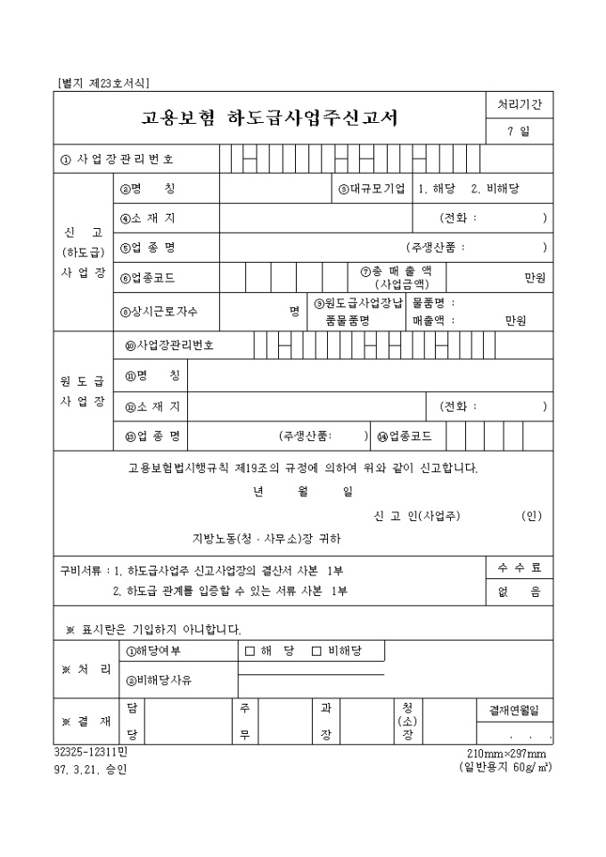 9,000원/월고용보험 하도급 사업주신고서 양식입니다.
