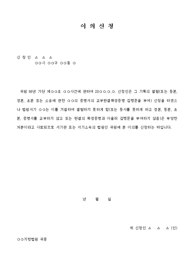○○사건에 관하여 그 기록의 열람(또는 등본, 정본, 초본 또는 소송에 관한 의 증명서의 교부판결확정증명 집행문을 부여) 신청을 하였으나 법원서기 는 이를 거절하여 열람하지 못하게 함이 부당한 처분이라고 사료되므로 서기관 또는 서기소속의 법원인 귀원에 본 이의를 신청하는 내용입니다.