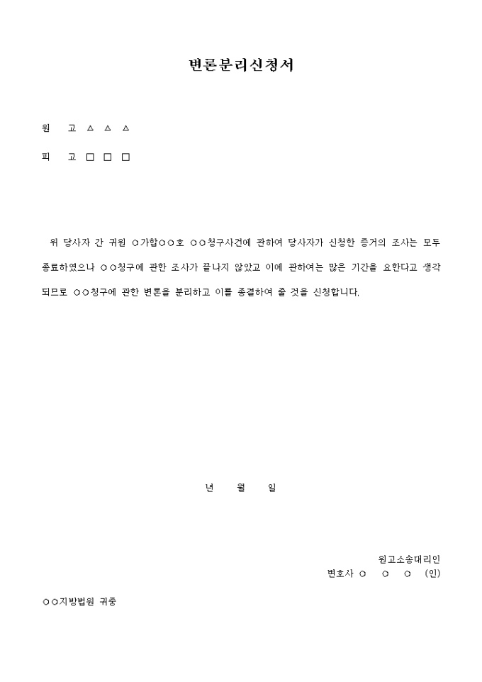 9,000원/월○○청구사건에 관하여 당사자가 신청한 증거의 조사는 모두 종료하였으나 ○○청구에 관한 조사가 끝나지 않았고 이에 관하여는 많은 기간을 요한다고 생각되므로 ○○청구에 관한 변론을 분리하고 이를 종결하여 줄 것을 신청한다는 내용입니다.