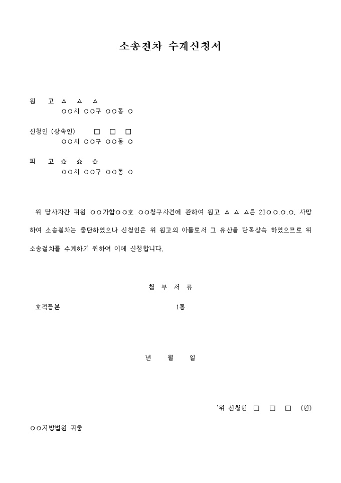 9,000원/월○○청구사건에 관하여 원고 △ △ △은 20○○.○.○. 사망하여 소송절차는 중단하였으나 신청인은 위 원고의 아들로서 그 유산을 단독상속 하였으므로 위 소송절차를 수계하기 위하여 이에 신청한다라는 내용입니다.
