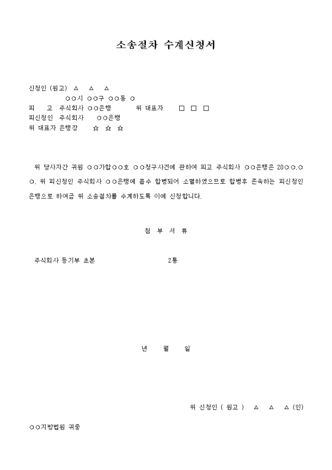 ○○청구사건에 관하여 피고 주식회사 ○○은행은 20○○.○○. 위 피신청인 주식회사 ○○은행에 흡수 합병되어 소멸하였으므로 합병후 존속하는 피신청인 은행으로 하여 금 위 소송절차를 수계하도록 이에 신청한다는 내용입니다.
