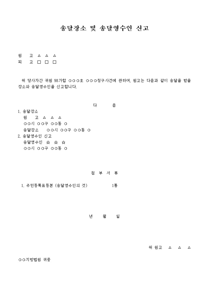 9,000원/월○○○청구사건에 관하여, 원고는 ...과 같이 송달을 받을 장소와 송달영수인을 신고한다는 내용입니다.