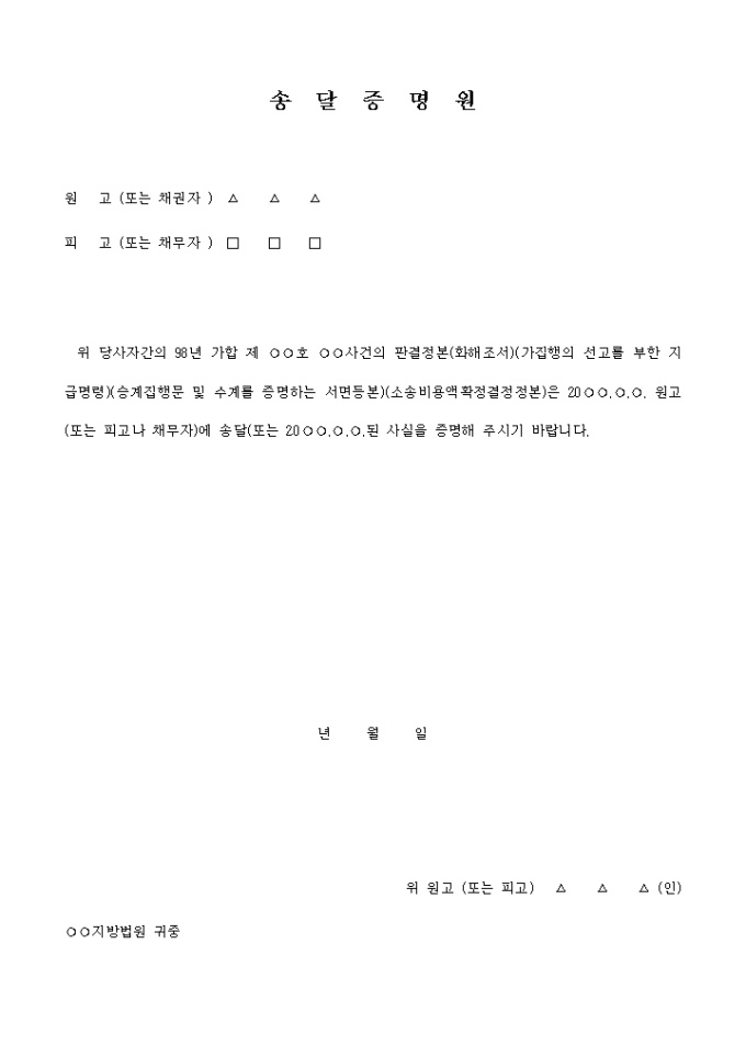 ○○사건의 판결정본(화해조서)(가집행의 선고를 부한 지급명령)(승계집행문 및 수계를 증명하는 서면등본)(소송비용액확정결정정본)은 20○○.○.○. 원고(또는 피고나 채무자)에 송달(또는 20○○.○.○.된 사실을 증명해 달라는 내용입니다.