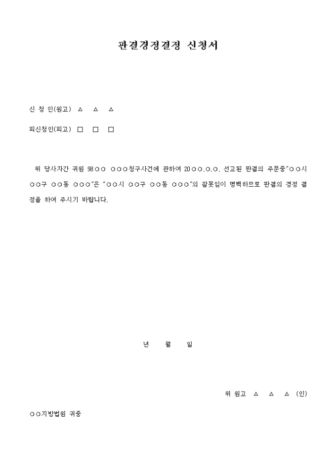 9,000원/월○○○청구사건에 관하여 20○○.○.○. 선고된 판결의 주문중“○○시 ○○구 ○○동 ○○○”은 “○○시 ○○구 ○○동 ○○○”의 잘못 임이 명백하므로 판결의 경정 결정을 요청하는 내용입니다.