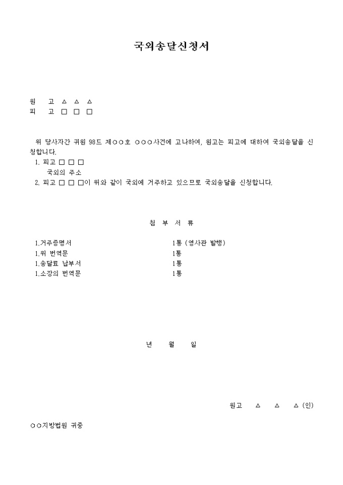 9,000원/월○○○사건에 관하여, 원고는 피고에 대하여 국외송달을 신청한다는 내용입니다.
