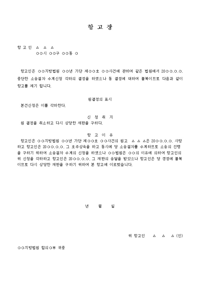 항고장(중단한 소송절차수계신청 각하결정의 경우)