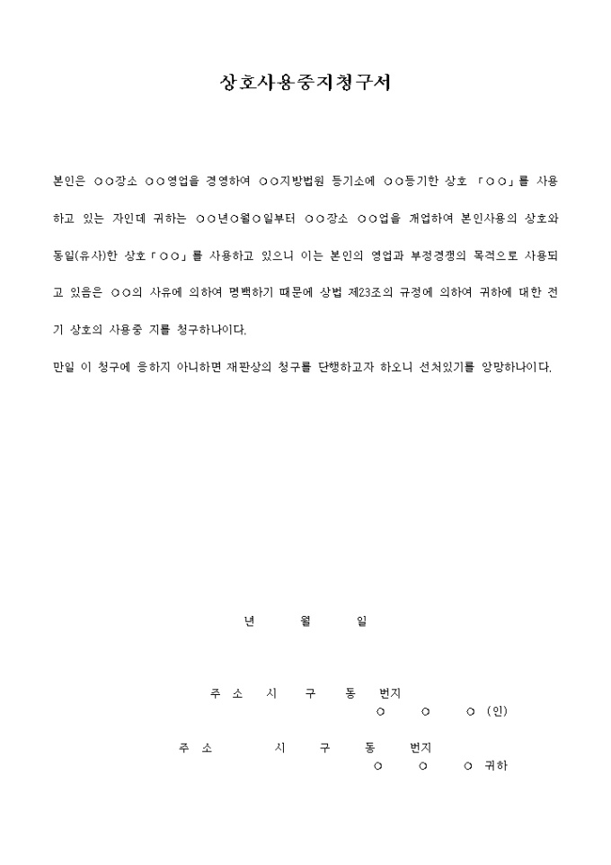 본인은 ○○장소 ○○영업을 경영하여 ○○지방법원 등기소에 ○○등기한 상호 「○○」를 사용하고 있는 자인데 귀하는 ○○년○월○일부터 ○○장소 ○○업을 개업하여 본인사용의 상호와 동일(유사)한 상호「○○」를 사용하고 있으니 이는 본인의 영업과 부정경쟁의 목적으로 사용되고 있음은 ○○의 사유에 의하여 명백하기 때문에 상법 제23조의 규정에 의하여 귀하에 대한 전기 상호의 사용중 지를 청구하나이다.