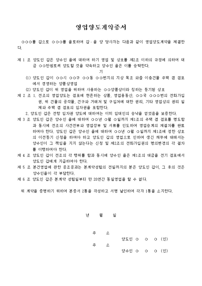 9,000원/월양품상 영업양도 계약증서 예제 입니다.