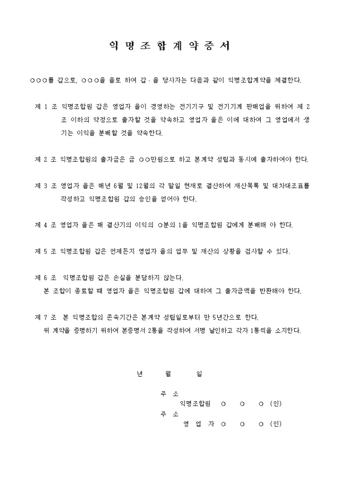 제 1 조 익명조합원 갑은 영업자 을이 경영하는 전기기구 및 전기기계 판매업을 위하여 제 2 조 이하의 약정으로 출자할 것을 약속하고 영업자 을은 이에 대하여 그 영업에서 생기는 이익을 분배할 것을 약속한다.