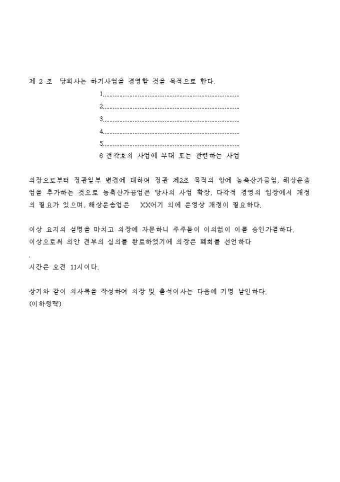 주주총회의사록 예제 입니다. 제 1 호 의안 XX주식회사와 체결한 합병계약서 승인의 건 출석주주로부터 합병에 이르기까지의 경위 및 금후의 견해에 있어서는 방금 의장으로부터 상세한 설명이 있었으며 이미 참고서류는 각각 당도하여 별단의 의문점이 없으니 축조 설명은 생략하고 일괄로 찬부를 묻기로 하자는 요지를 발언하다. 이에 따라 의장은 제1호 의안에 대한 찬부를 의장에 자문한 즉 주주들이 이에 찬성 하여 만장일치로 승인 가결하다. 제 2 호 의안 정관일부변경의 건 정관 제2조를 다음과 같이 변경한다. ...
