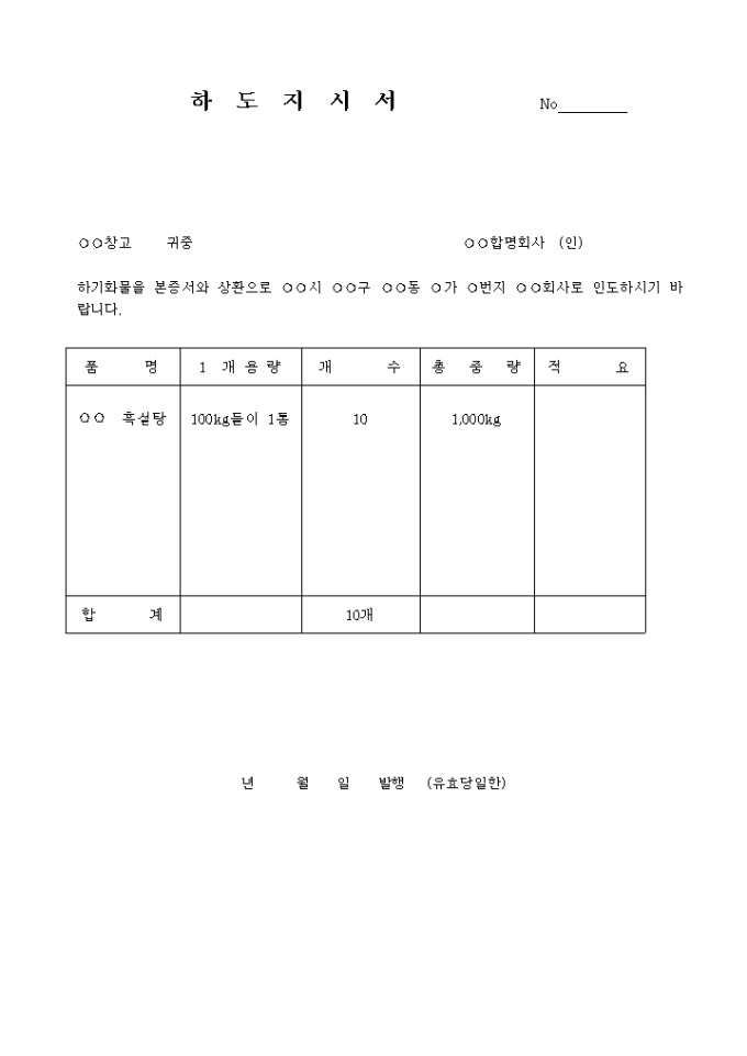 하도지시서 입니다. 하기화물을 본증서와 상환으로 ○○시 ○○구 ○○동 ○가 ○번지 ○○회사로 인도하시기 바랍니다. ...