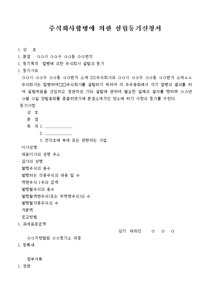 1. 등기목적 합병에 의한 주식회사 설립의 등기