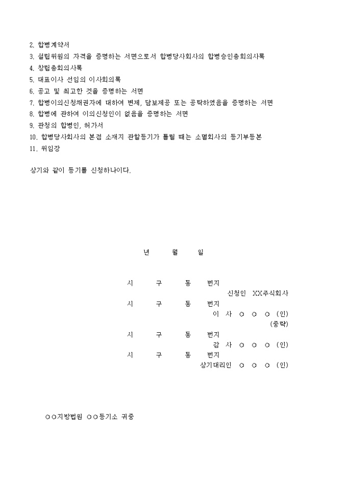 시 구 동 번지 소재 XX주식회사와 시 구 동 번지 소재 주식회사는 합병하여□□주식회사를 설립하기 위하여 각 주주총회에서 각기 합병의 결의를 하여 설립위원을 선임하고 정관작성 기타 설립에 관하여 필요한 일체의 절차를 행하며 년 월 일 창립총회를 종결하였기에 본점소재지인 당소에 하기 사항의 등기를 구한다.