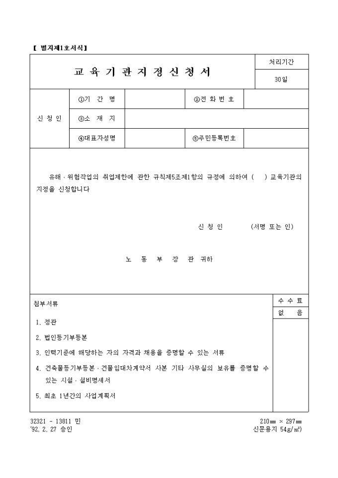* 유해․위험작업의 취업제한에 관한 규칙제5조제1항의 규정에 의하여 ( ) 교육기관의 지정을 신청합니다