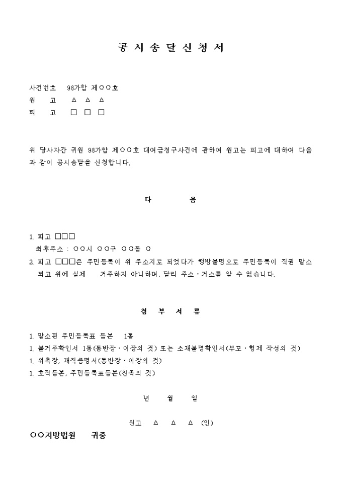 제○○호 대여금청구사건에 관하여 원고는 피고에 대하여 ..과 같이 공시송달을 신청한다는 내용입니다.