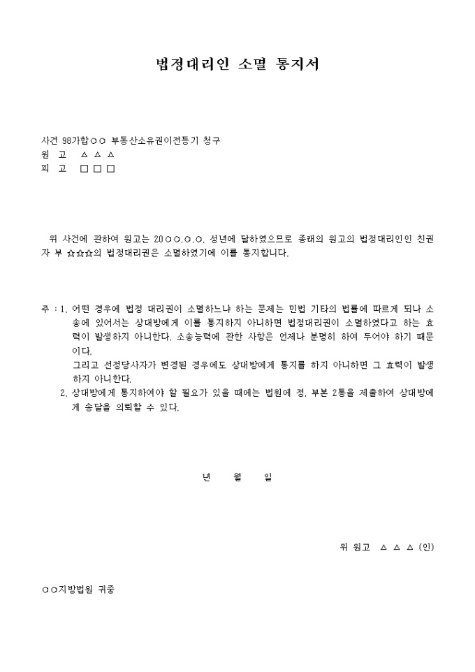 부동산소유권이전등기 청구에 의한 원고가 성년에 달하였으므로 종래의원고의 법정대리인인 친권자의 법정대리권은 소멸하였을 알리는 내용입니다.