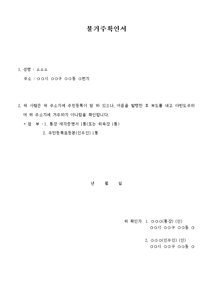 9,000원/월...사람은 주소지에 주민등록이 된 바 있으나, 어음을 발행한 후 부도를 내고 야반도주하여 위 주소지에 거주하지 아니함을 확인하는 내용입니다.