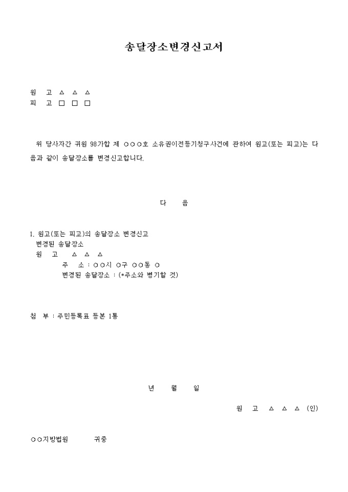 9,000원/월소유권이전등기청구사건에 관하여 원고(또는 피고)는 ...과 같이 송달장소를 변경신고한다는 내용의 양식입니다.