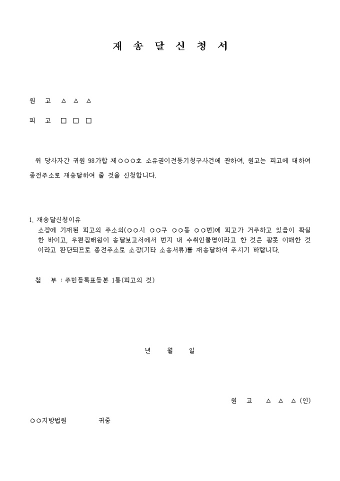 소유권이전등기청구사건에 관하여 , 원고는 피고에 대하여 종전주소로 재송달하여 줄 것을 신청한다는 내용입니다.