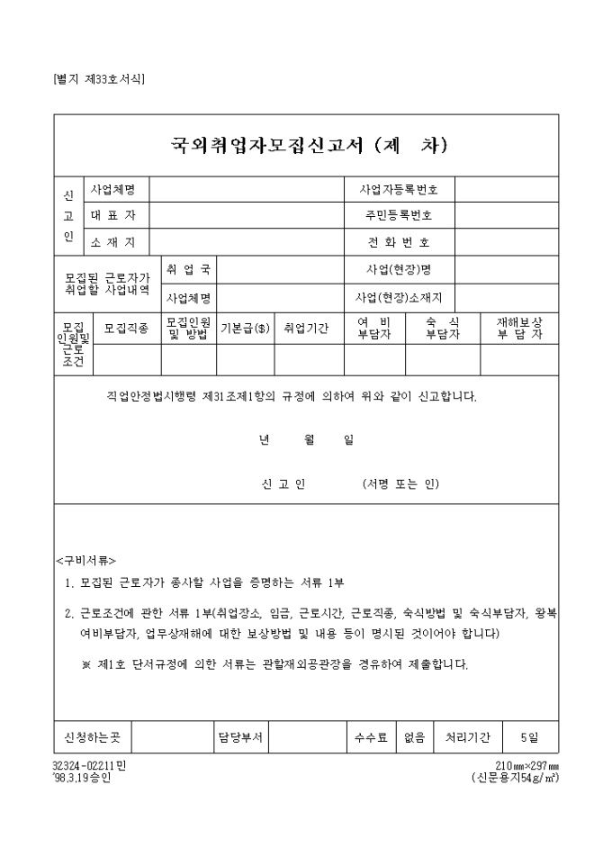 9,000원/월국외 취업자 모집신고서(제 차) 양식입니다.