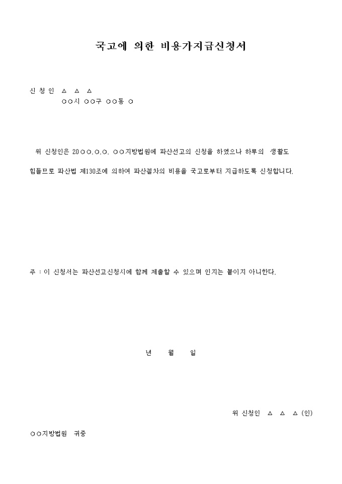 ...지방법원에 파산선고의 신청을 하였으나 하루의 생활도 힘들므로 파산법 제130조에 의하여 파산절차의 비용을 국고로부터 지급하도록 신청한다는 내용입니다.