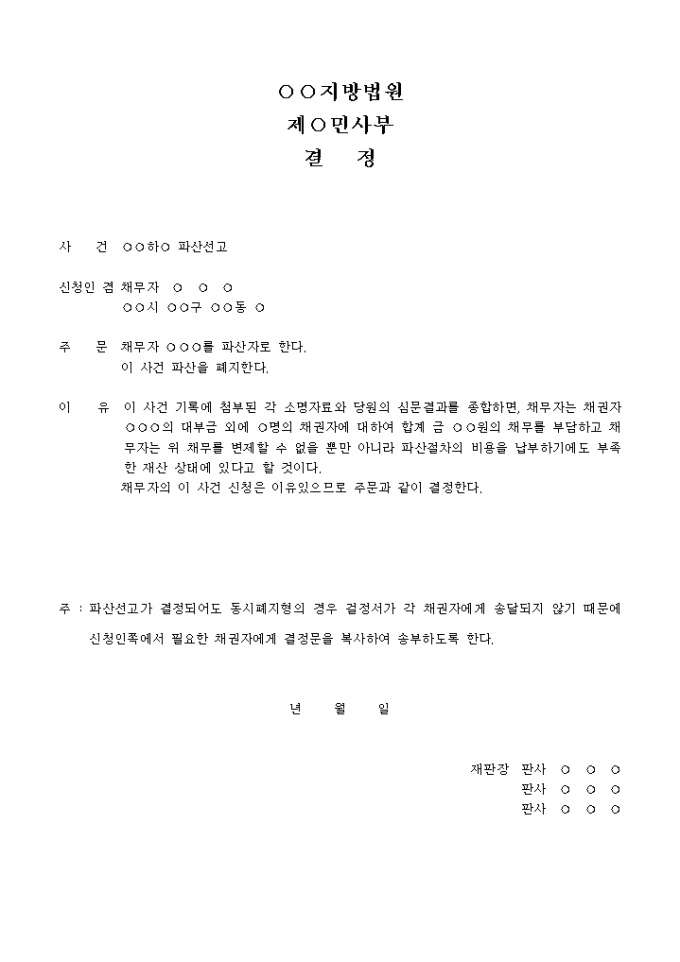 9,000원/월채무자 ○○○를 파산자로 한다.이 사건 파산을 폐지한다라는 내용의 결정서입니다. .