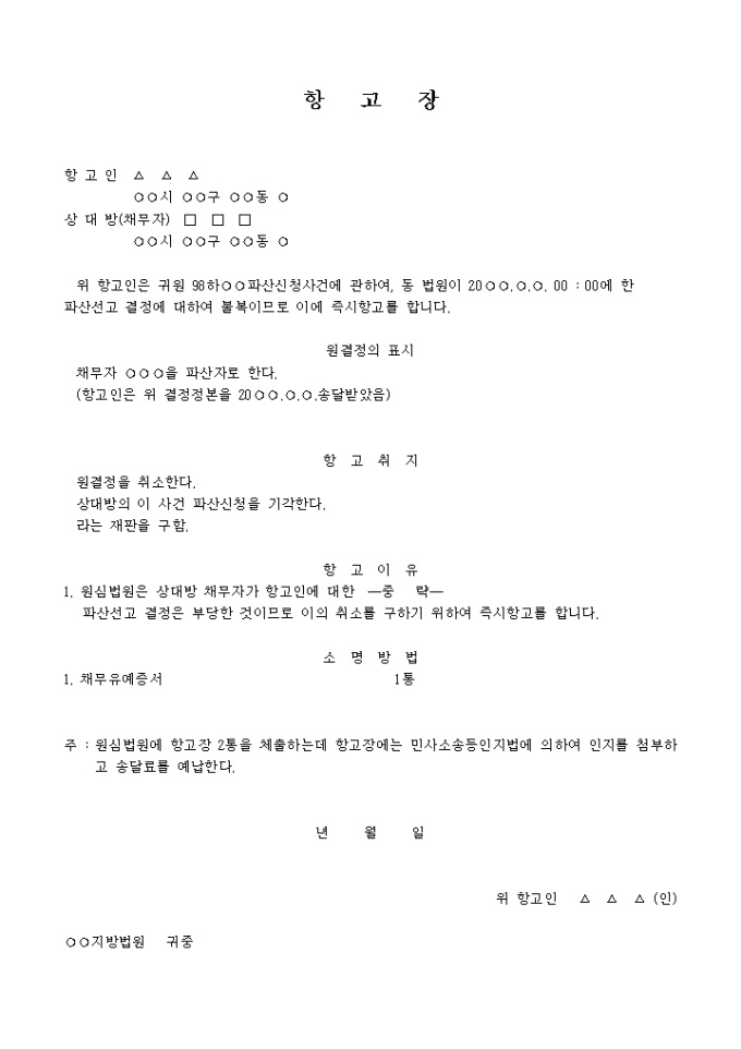 9,000원/월파산신청사건에 관하여, 동 법원이 20○○.○.○. 00 : 00에 한 파산선고 결정에 대하여 불복이므로 이에 즉시항고를 한다는 내용입니다.