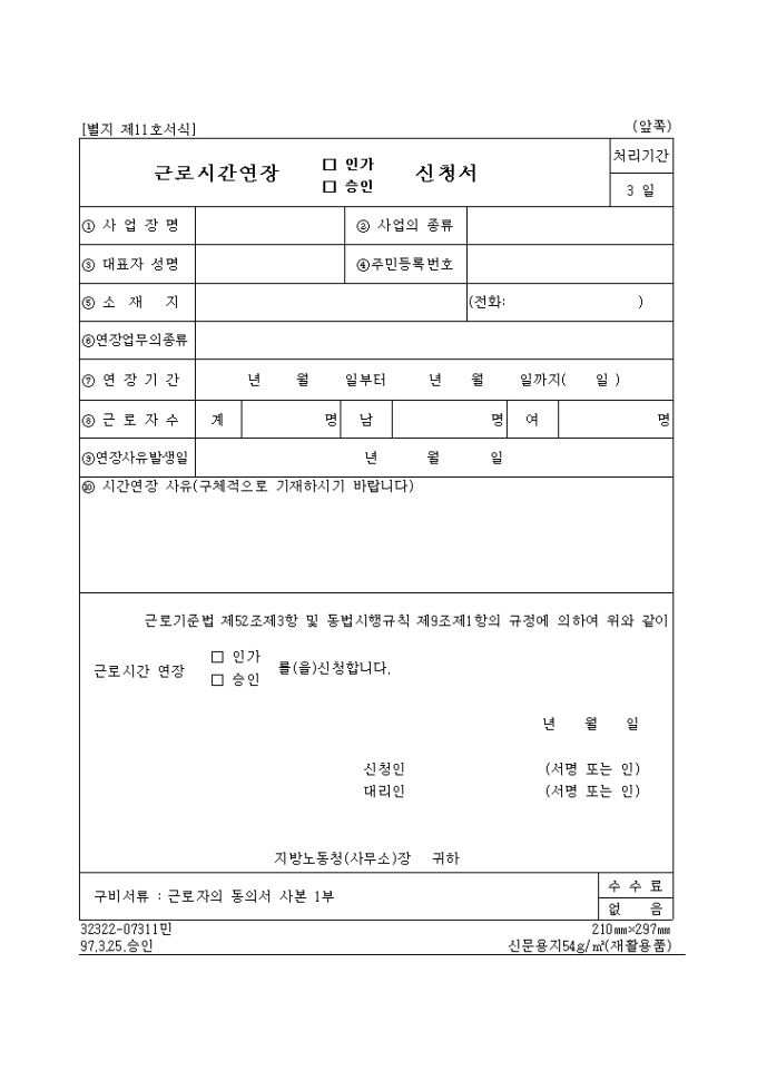 근로시간 연장 □ 인가 □ 승인를(을)신청합니다.