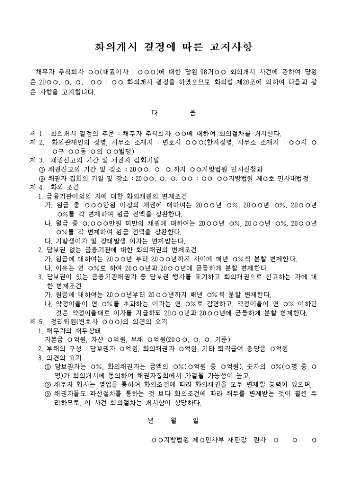 화의개시 사건에 관하여 당원은 20○○. ○. ○. ○○ : ○○ 화의개시 결정을 하였으므로 화의법 제28조에 의하여 ...과 같은 사항을 고지한 내용입니다.