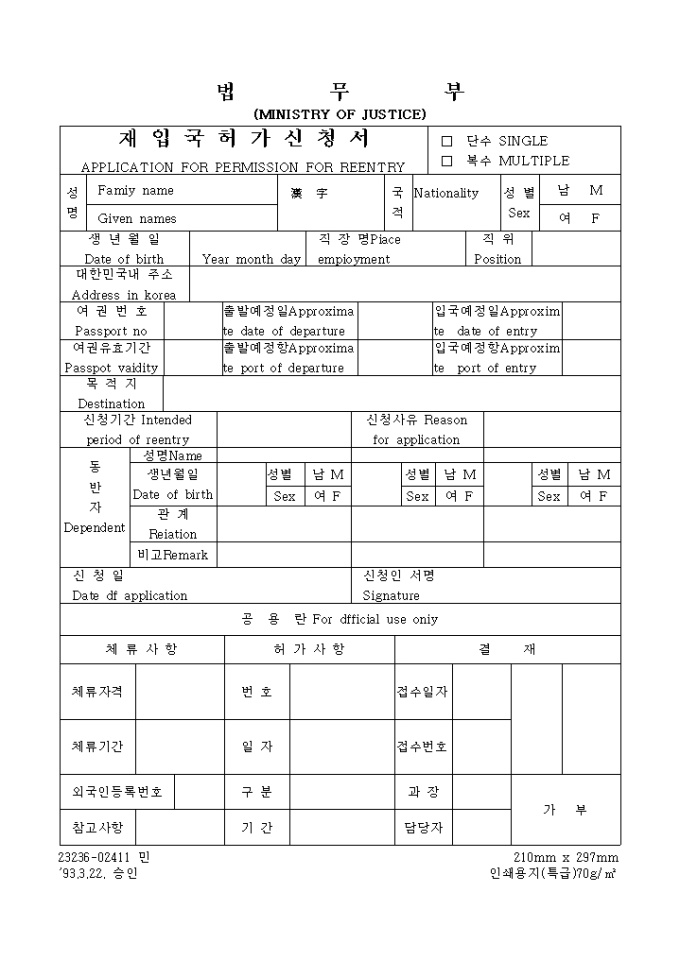 9,000원/월재입국허가신청서 양식입니다. APPLICATION FOR PERMISSION FOR REENTRY ...