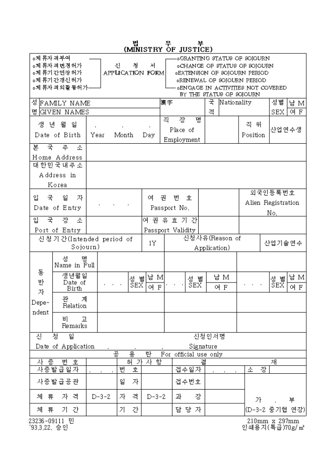 9,000원/월체류자격변경신청서 양식입니다. ○체류자격부여 ○GRANTING STATUS OF SOJOURN ○체류자격변경허가 ○CHANGE OF STATUS OF SOJOURN ○체류기간연장허가 ○EXTENSION OF SOJOURN PERIOD ○체류기간갱신허가 ○RENEWAL OF SOJOURN PERIOD ○체류자격외활동허가 ○ENGAGE IN ACTIVITIES NOT COVERED BY THE STATUS OF SOJOUR