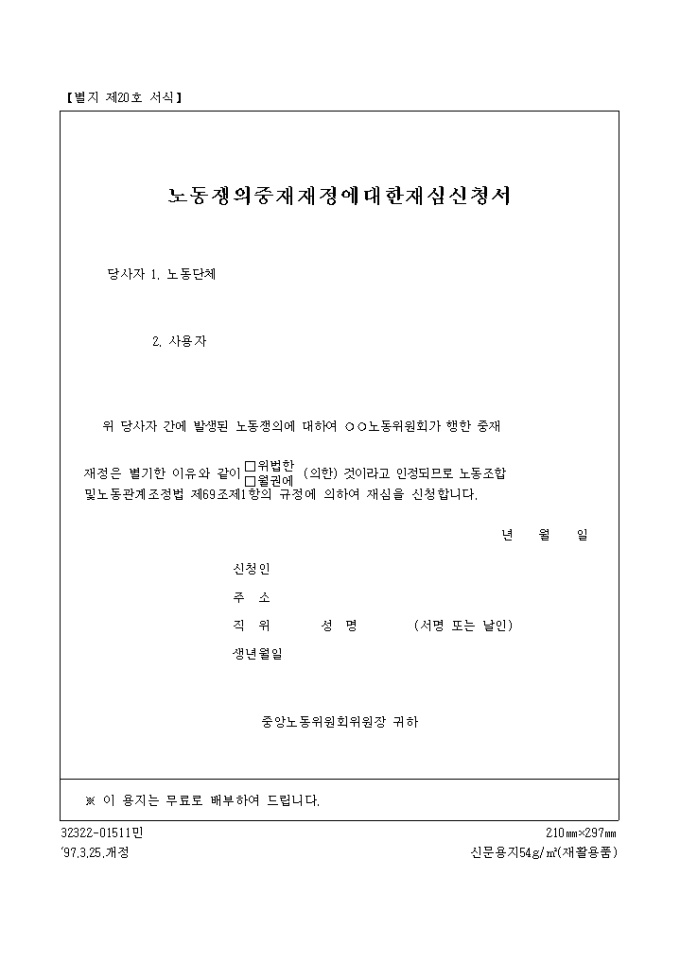 9,000원/월당사자 간에 발생된 노동쟁의에 대하여 ○○노동위원회가 행한 중재 재정은 별기한 이유와 같이 □위법한 □월권에 (의한) 것이라고 인정되므로 노동조합 및 노동관계조정법 제69조제1항의 규정에 의하여 재심을 신청하기 위한 "노동쟁의 중재 재정에 대한 재심신청서" 양식입니다.