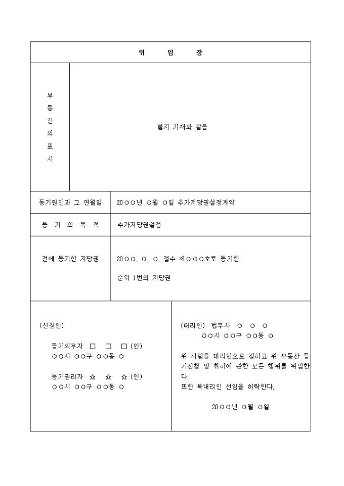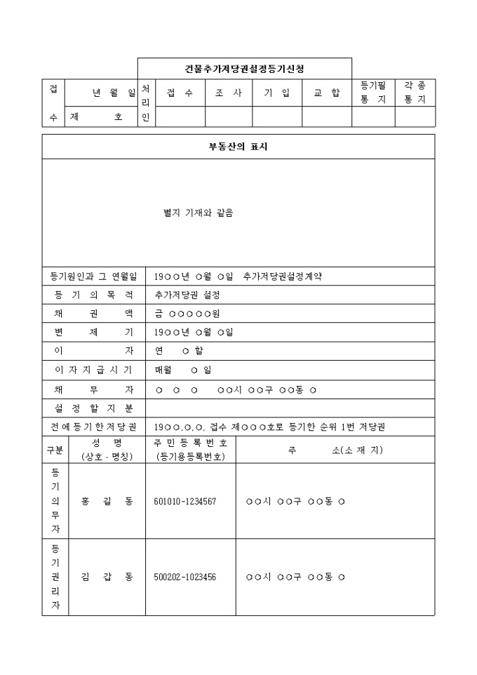 추가저당권 설정 : 19○○.○.○. 접수 제○○○호로 등기한 순위 1번 저당권