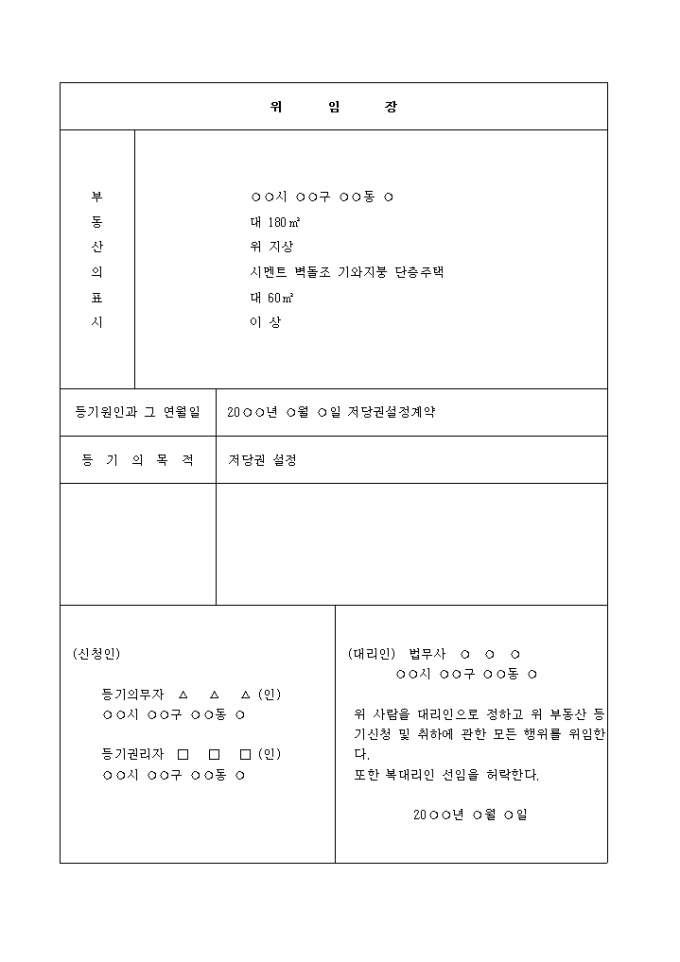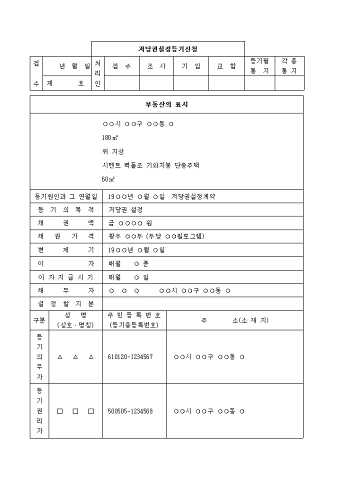 등기원인과 그 연월일 : 19○○년 ○월 ○일 저당권설정계약