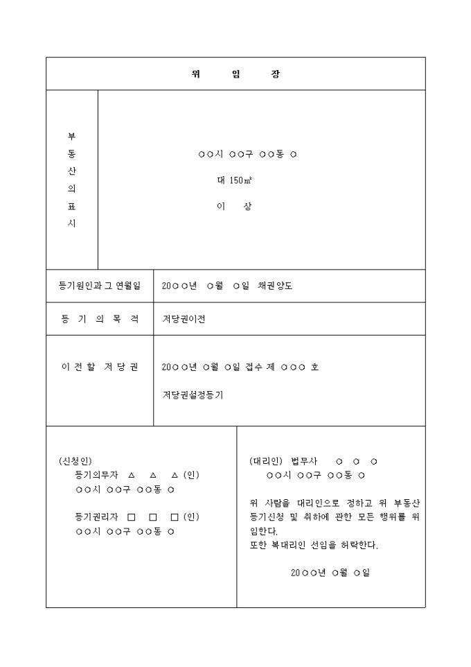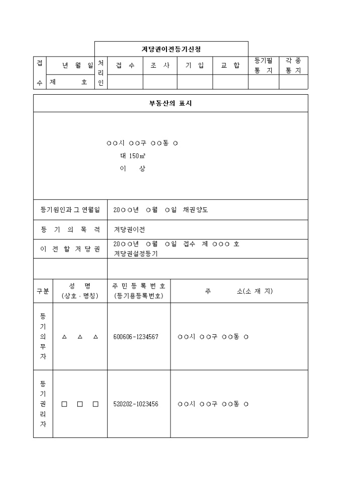 이 전 할 저 당 권 : 20○○년 ○월 ○일 접수 제 ○○○ 호 저당권설정등기