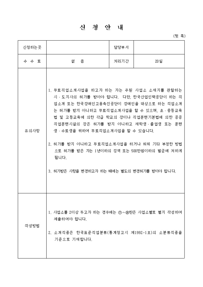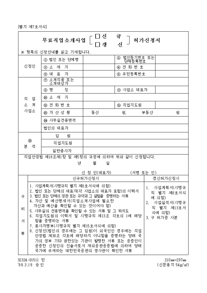 9,000원/월직업안정법 제18조제1항 및 제5항의 규정에 의하여 신청하기 위한 "무료 직업 소개사업(신규,갱신)허가신청서" 양식입니다.
