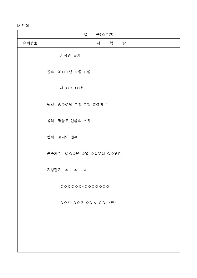 지상권설정등기신청서 기재례