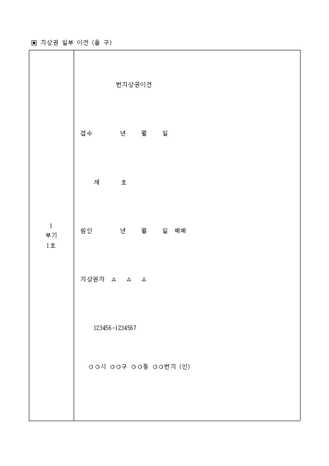 지상권에 관한 등기(지상권 일부이전) 입니다. 번지상권이전 접수 년 월 일 제 호 원인 년 월 일 매매 지상권자 ...