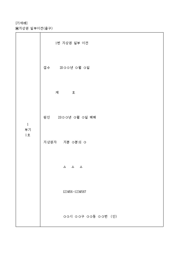 지상권이전등기신청서(지상권 일부이전) 입니다.