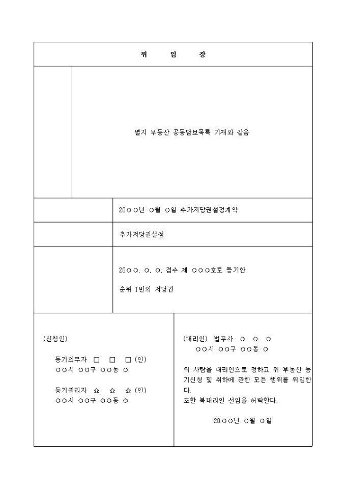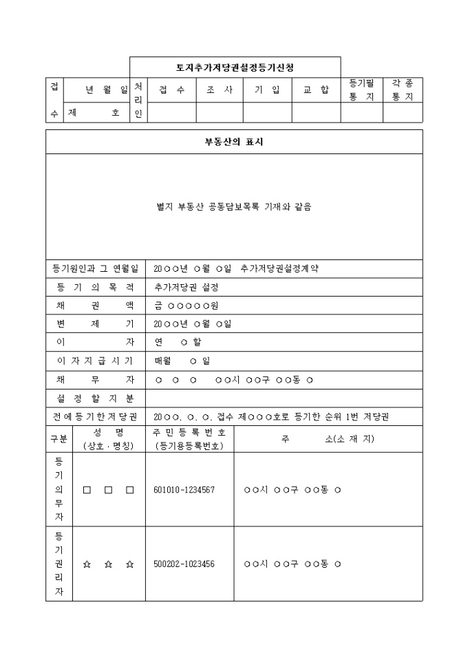 추가저당권설정등기(공동담보목록에 공동담보목록추가)신청서 입니다.