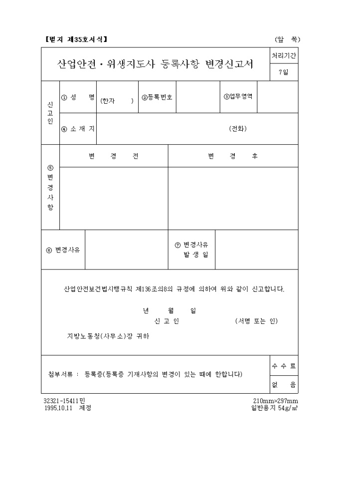 9,000원/월산업안전보건법시행규칙 제136조의8의 규정에 의하여 위와 같이 신고하기 위한 산업 안전, 위생지도사 등록사항 변경신고서 양식입니다.