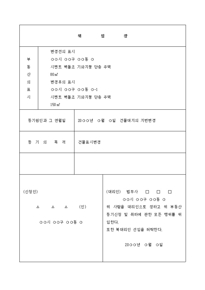 등기원인과 그 연월일 : 20 년 월 일 건물대지의 지번변경