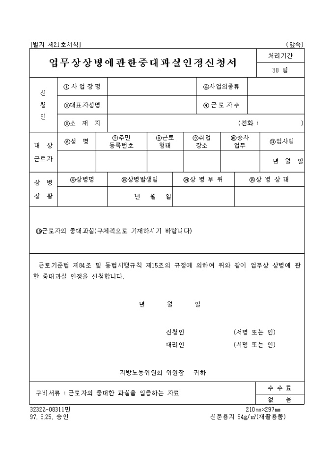 근로기준법 제84조 및 동법시행규칙 제15조의 규정에 의하여 위와 같이 업무상 상병에 관한 중대과실 인정을 신청할 때 쓰는 "업무상 상병에 관한 중대 과실 인정신청서" 양식입니다.