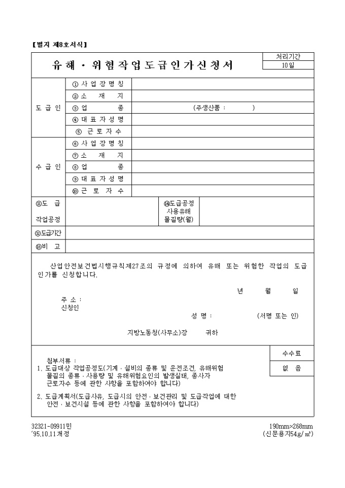 9,000원/월산업안전보건법시행규칙제27조의 규정에 의하여 유해 또는 위험한 작업의 도급인가를 신청할 때 쓰이는 "유해, 위험작업 도급 인가신청서" 양식입니다.