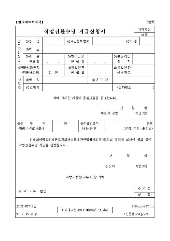 진폐의예방과진폐근로자의보호등에관한법률제37조제2항의 규정에 의하여 위와 같이 작업전환수당 지급을 신청할 때 쓰이는 "작업전환수당 지급신청서" 양식입니다.