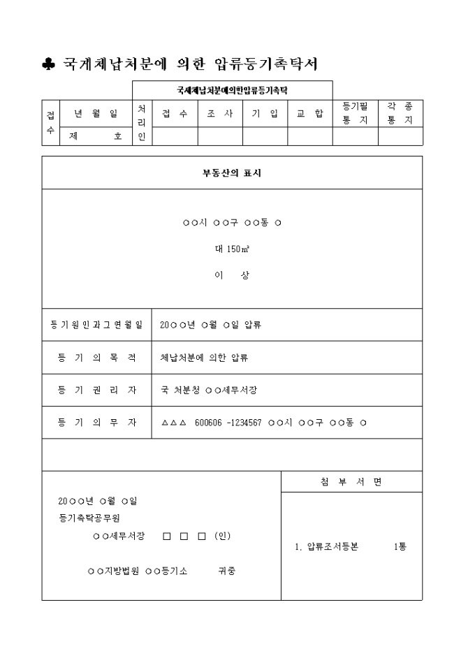 국세체납처분에 의한 압류등기촉탁서 입니다.